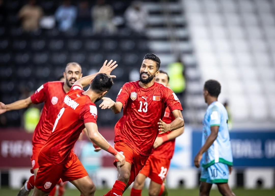 Bahrain's Mohamed Al Romaihi (centre) celebrates with teammates after scoring a goal against Djibouti. PIC: Bahrainfa