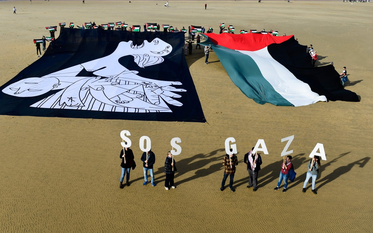 Demonstrators hold a canvas with a detail of Spanish painter Pablo Picasso's masterpiece "Guernica" depicting a mother, and wave a giant Palestinian flag during a protest in solidarity with the Palestinian people under the slogan "SOS Gaza", on La Concha beach in the Spanish Basque city of San Sebastian on January 28, 2024