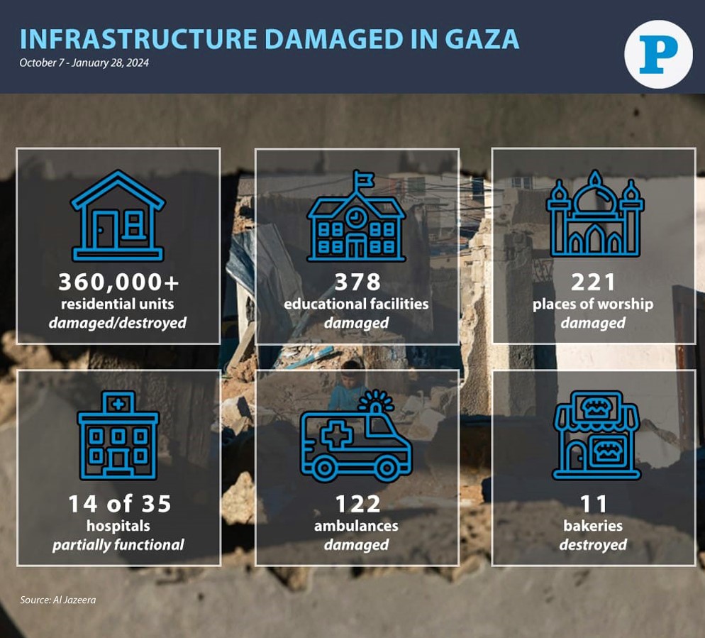 According to the latest data from the UN’s Office for the Coordination of Humanitarian Affairs (OCHA), the World Health Organization (WHO) and the Palestinian government as of January 28, Israeli attacks have damaged: