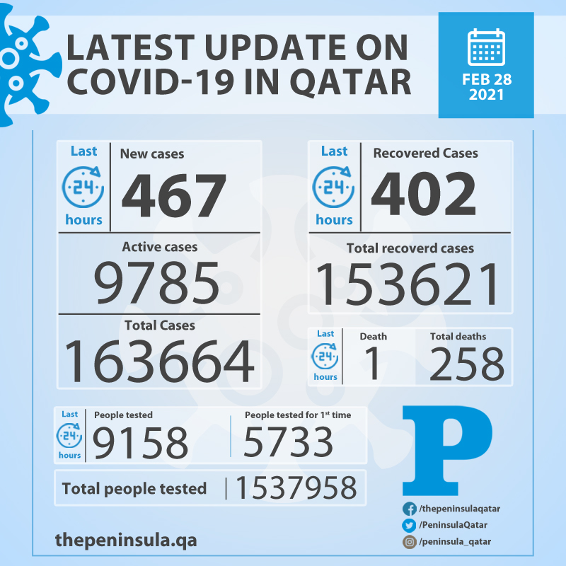 Doha: Ministry of Public Health (MoPH) today reported 467 new cases of coronavirus (Covid-19) and 402 people recovered from the virus in the last 24 hours, bringing the total number of people recovered in Qatar to 153,621.