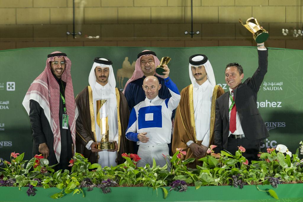 The connection of Hadi De Carrerre celebrate after Khalifa bin Sheail Al Kuwari's five-year-old purebred Arabian won the Obaiya Arabian Classic Cup (Gr.2 PA) at the Saudi Cup in Riyadh, yesterday.