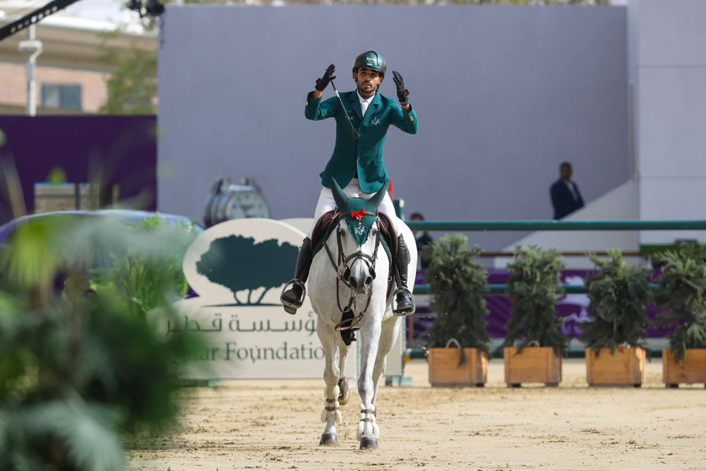A Saudi rider celebrates during the first day of Doha International Showjumping Championship.