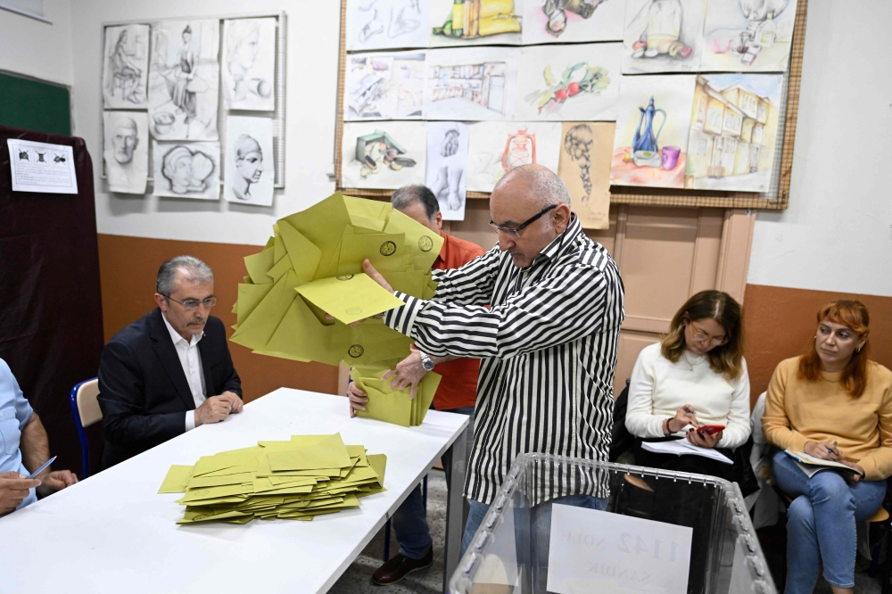 Observers watch as officials count votes on the day of the second round of the presidential election in Istanbul on May 28, 2023. (Photo by Yasin AKGUL / AFP)