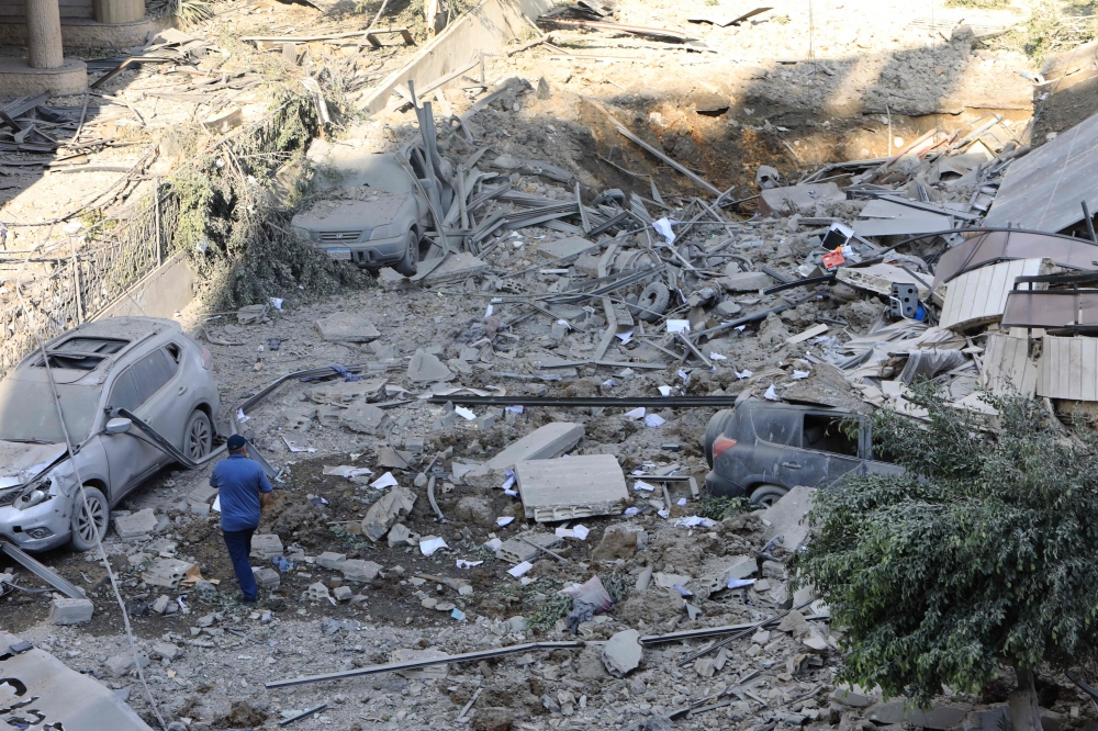 A man inspects the massive damage on September 28, 2024 in the Hadath neighbourhood of Beirut's southern suburbs. (Photo by AFP)