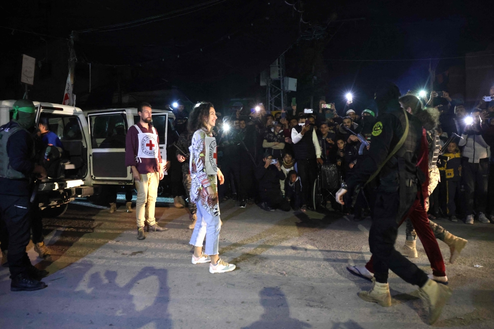 [11:00pm Doha Time] Hamas fighters accompany newly released hostages this evening, November 28, before handing them over to Red Cross officials in Rafah, on the Palestinian side of the border with Egypt. (Photos: AFP)