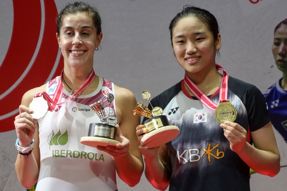 In the women's singles final, world number two An made a stunning comeback to beat Spain's three-time world champion Carolina Marin 18-21, 21-18, 21-13.
