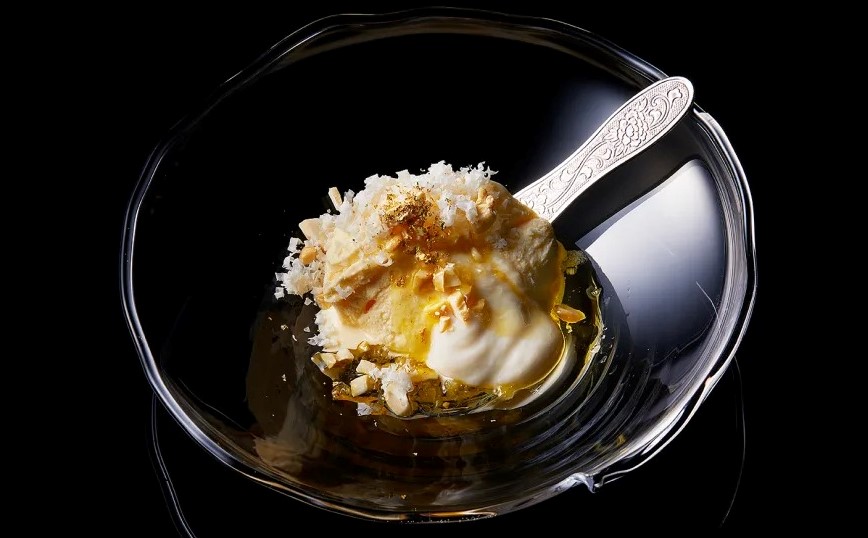 With the goal of fusing European and Japanese ingredients, Cellato brought together white truffles, known as 'white diamonds', costing around QR55,000 per kilogram, and Parmigiano Reggiano, both from Italy, as well as a fermented paste with a sweet, fruity flavour from Japan.