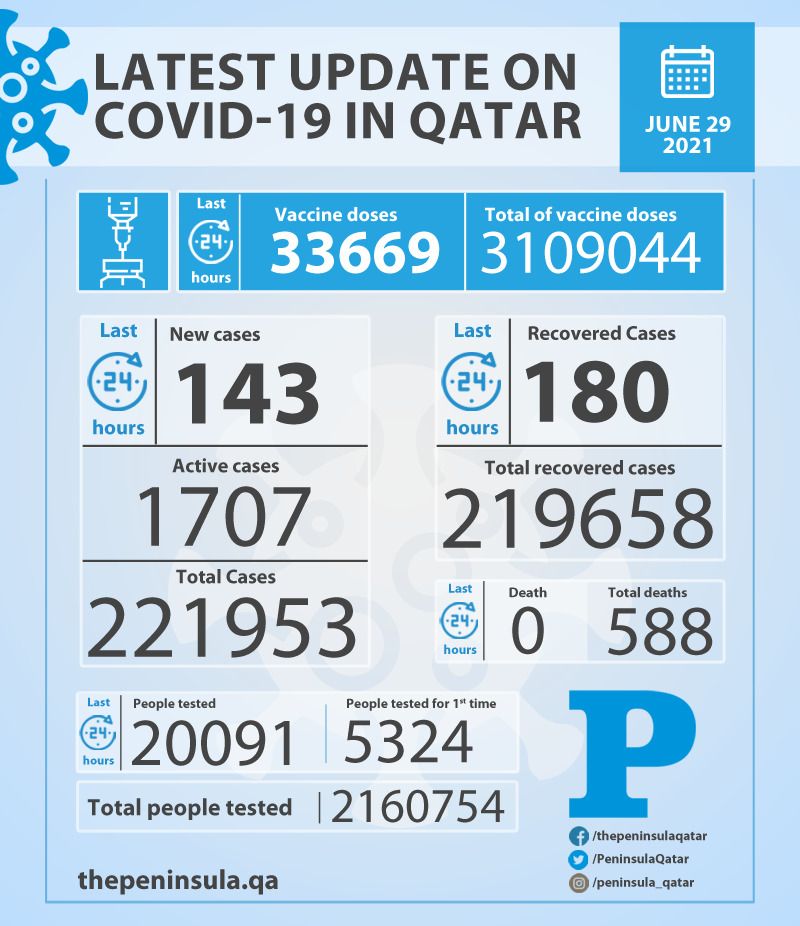 Doha: Ministry of Public Health (MoPH) today reported 143 new cases of coronavirus (Covid-19) and 180 people recovered from the virus in the last 24 hours, bringing the total number of people recovered in Qatar to 219,658.