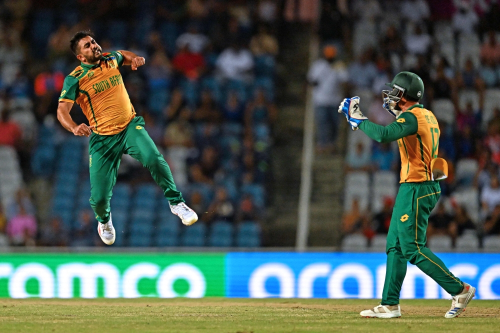 South Africa's Tabraiz Shamsi (left) celebrates after the dismissal of Afghanistan's Karim Janat (out of frame) during the ICC men's Twenty20 World Cup 2024 semi-final cricket match between South Africa and Afghanistan at Brian Lara Cricket Academy in Tarouba, Trinidad and Tobago, on June 26, 2024. (Photo by Chandan Khanna / AFP)