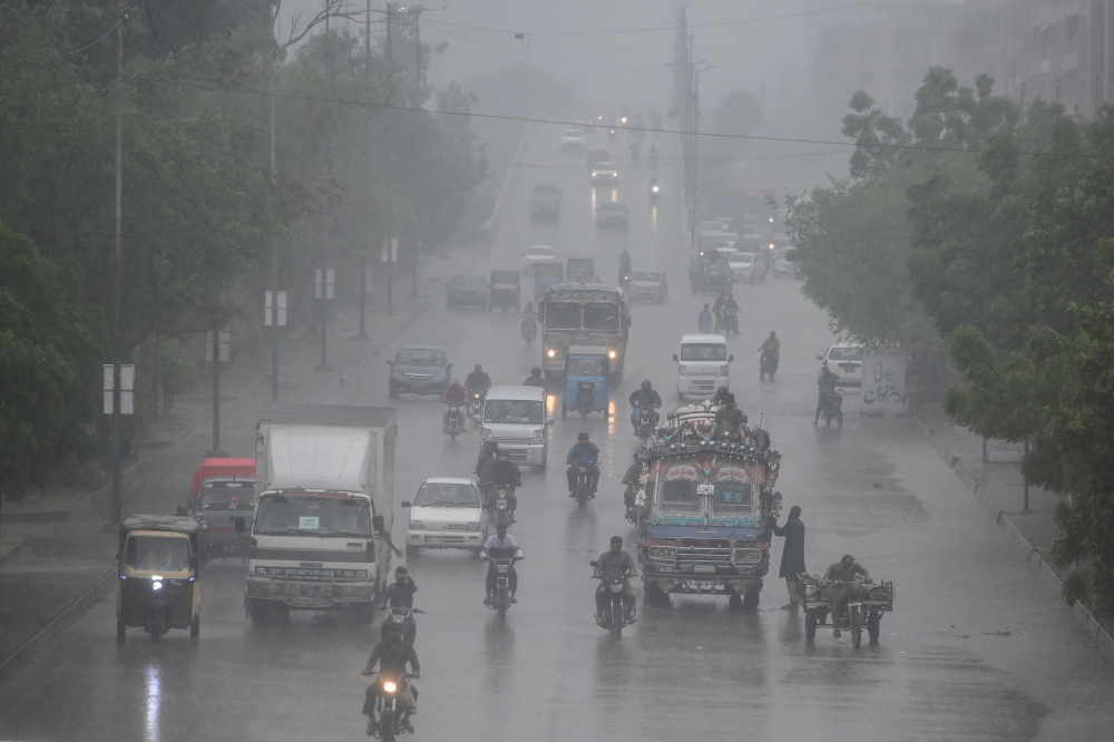 Commuters make their way along a road as it rains in Karachi on June 28, 2025. (Photo by Rizwan Tabassum / AFP)