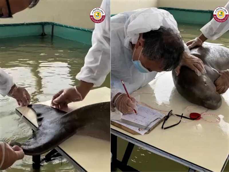 The MoECC said that it has taken the necessary measures to transport the baby dugong to the Fuwairit (Sea Turtle Project) area, and has been placed in an equipped pond adjacent to 'Ocean' and 'Oscar'.