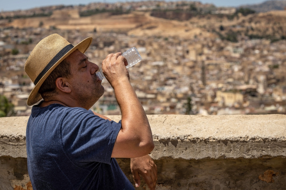 A man drinks water during during a heatwave in the city of Fez in Morocco on July 26, 2024. (Photo by Fadel Senna / AFP)