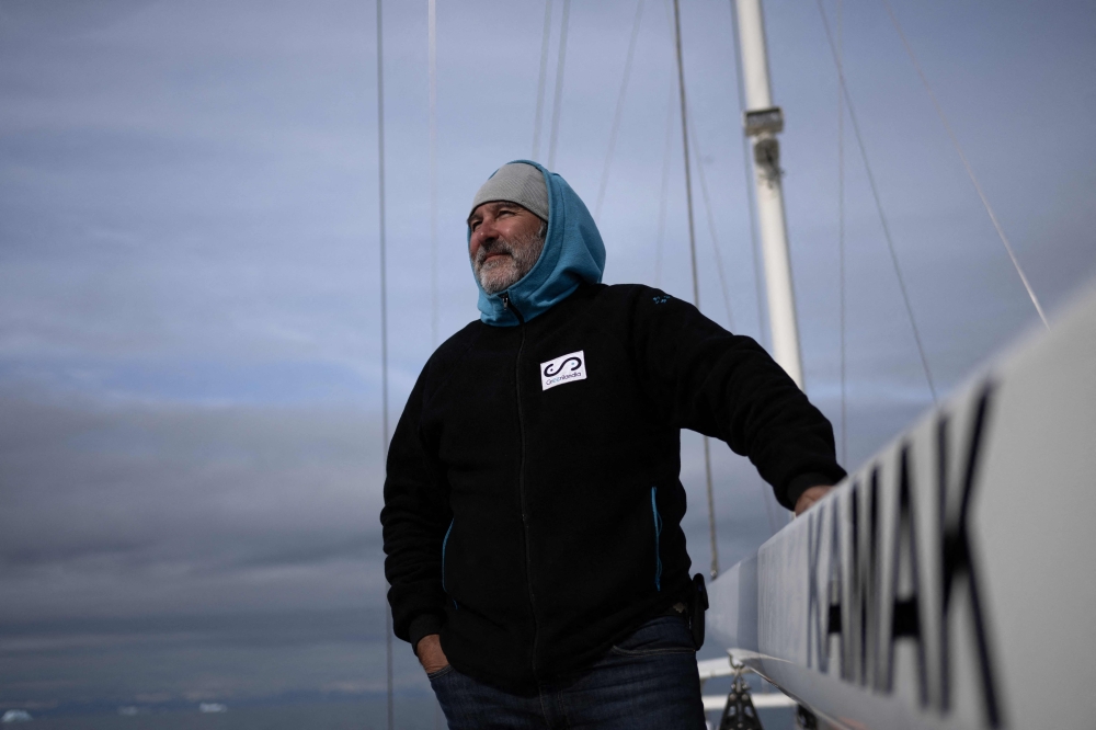 Chief of Greenlandia's expedition, France's Vincent Hilaire looks out as the sailing ship 'Kamak' sails. (Photo by Olivier Morin / AFP)