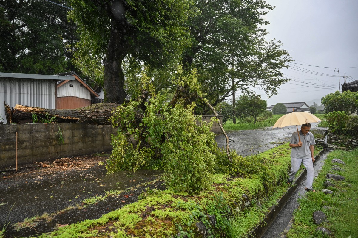 A man walks past a fallen tree brought down by strong winds from Typhoon Shanshan in Usa, Oita prefecture on August 29, 2024. Photo by Yuichi YAMAZAKI / AFP