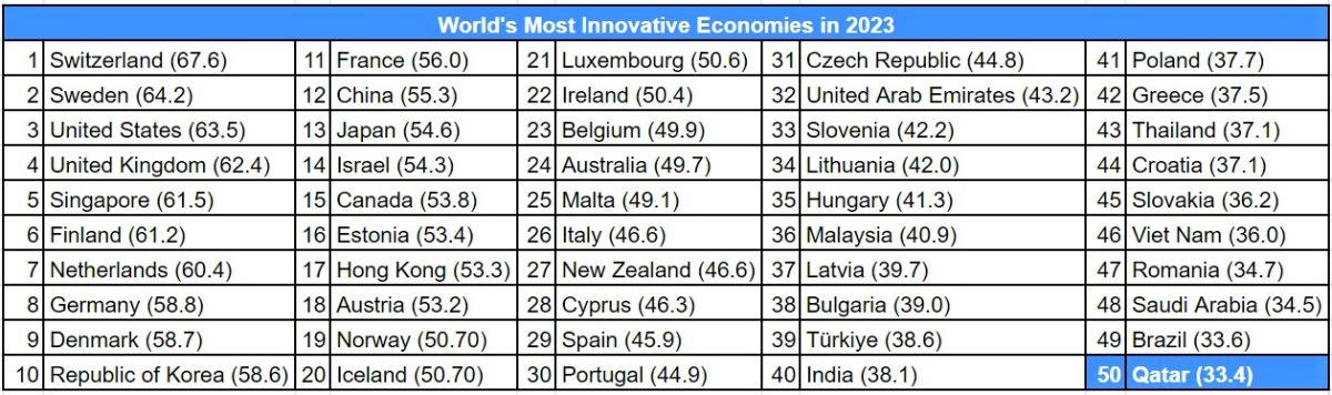 Doha: Qatar has moved up two places in the Global Innovation Index (GII) compared to 2022 and now ranks 50th among 132 countries, according to a report released by the UN's World Intellectual Property Organization (WIPO) on September 27.