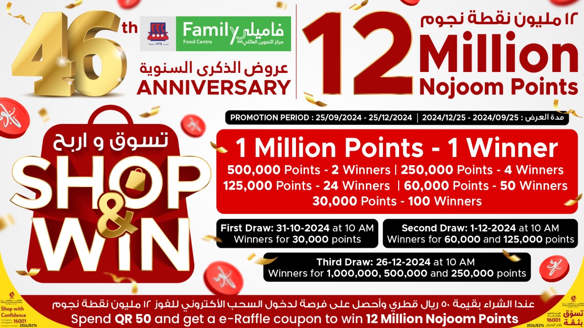 For every QR 50 spent at Family Food Centre, shoppers will receive an e-raffle coupon. Customers can register their receipts online at https://lucky-draw.family.qa/ or at the receipt registration counters available at each outlet. In total, 180 lucky winners will share 12 million Nojoom points across multiple prize draws.