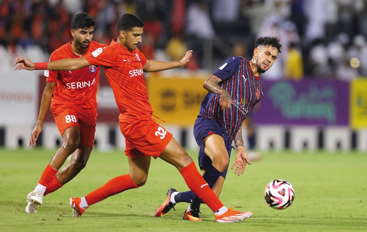Al Shahania's Ali Al Amri (centre) vies for the ball with Al Duhail's Edmilson Junior during their Ooredoo Stars League Round 6 match.
