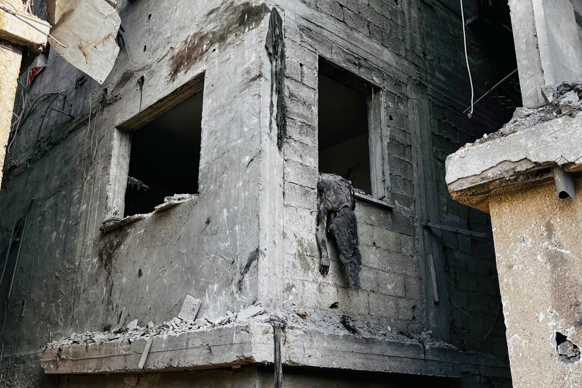 Graphic content / A body of a child hangs out of a window of a building in Beit Lahia, in the northern Gaza Strip, on October 29, 2024. Photo by AFP.