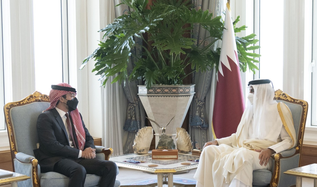 Doha: The Amir H H Sheikh Tamim bin Hamad Al Thani met HRH Prince Al Hussein bin Abdullah II, Crown Prince of the Kingdom of Jordan, and the accompanying delegation in his office at the Amiri Diwan this morning.