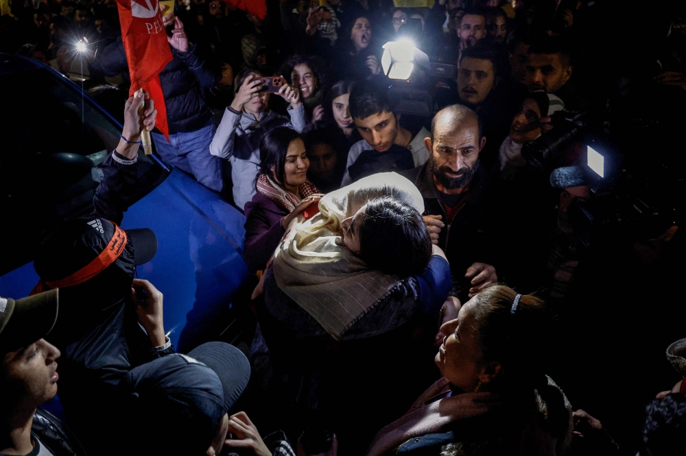 A newly released Palestinian prisoner Rouba Assi hugs relatives during a welcome ceremony for prisoners freed from Israeli jails in exchange for Israeli hostages released by Hamas from the Gaza Strip, during a welcome ceremony in Ramallah in the occupied West Bank on November 28, 2023. (Photo by Kenzo Tribouillard / AFP)