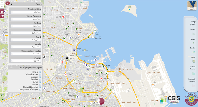 The search option supported map is attached with a detailed map of Qatar listing names of the places which will help to find the targeted areas. The map is showing the places in multi-layers by names of farms, municipality, public parks, beaches, Rawd (green areas), islands, natural reserves and agricultural complexes (Al Adhab).