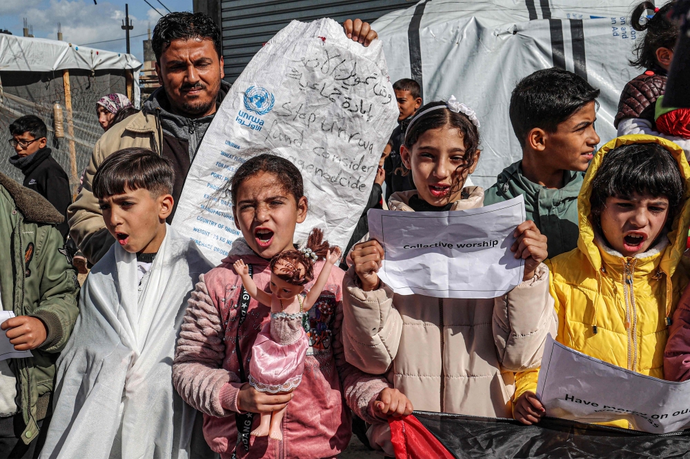 Palestinian men and children gather for a demonstration in Rafah in the southern Gaza Strip on January 30, 2024, calling for continued international support to UNRWA. (Photo by AFP)
