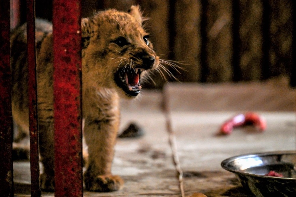 A lion cub confiscated from Pakistani YouTube star Rajab Butt, growls inside his enclosure, at a safari zoo in Lahore on January 28, 2025. (Photo by Arif Ali / AFP)