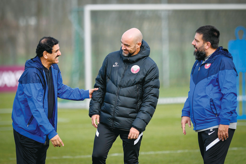 Qatar coach Felix Sanchez with team officials during a training session yesterday.