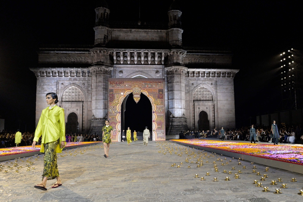 Flanked by the brightly lit, iconic Taj Mahal Hotel, the spectacular decor turned the heritage site in India’s entertainment and business capital into a blend of color and style as the models lined up to showcase the Paris fashion house's 2023 pre-fall collection.