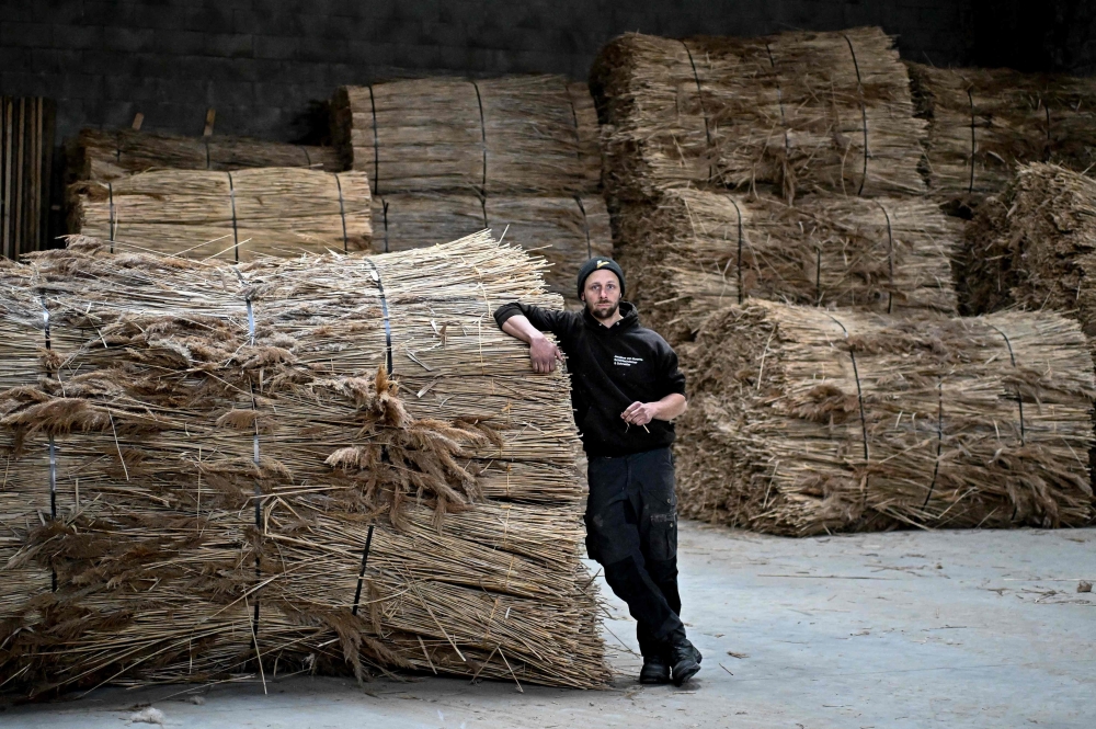 Jacobus van Hoorne, a 37-year-old former physicist at Cern and now reed farmer, checks stacks of reed at his storage at Weiden am See, Austria on March 9, 2023. Photo by JOE KLAMAR / AFP