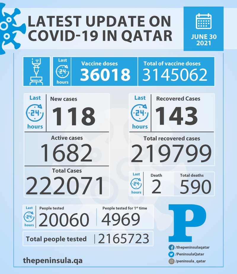 The total number of positive Covid-19 cases recorded in Qatar till now is 222,071 and there are 1,682 active cases under treatment.