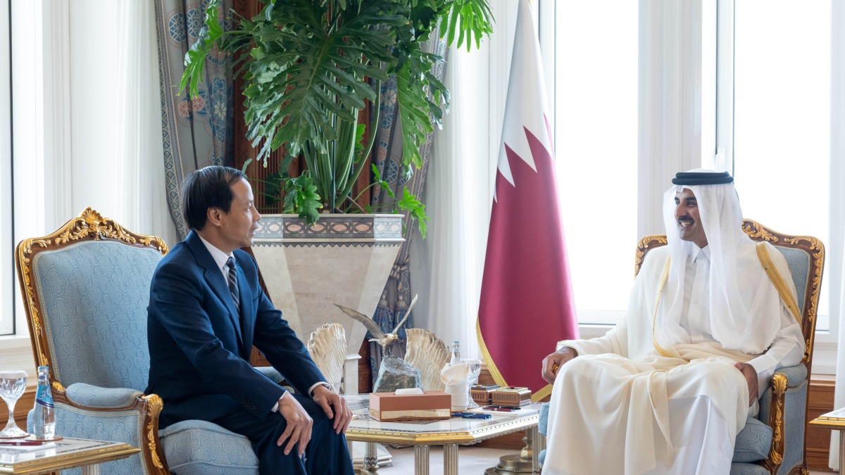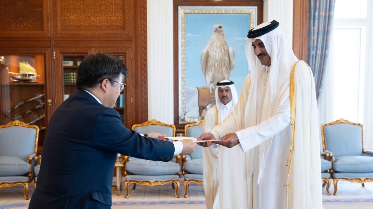 His Highness received the credentials of HE Mohammed bin Ali Al Ghatam, Ambassador of the Kingdom of Bahrain to Qatar; HE Nurmurod Mahmadali, Ambassador of the Republic of Tajikistan; HE Jose Rafael Aguero Avila, Ambassador of the Republic of Paraguay; HE Thierno Abdoulaye Sow, Ambassador of the Republic of Guinea (Conakry); HE Nguyen Huy Hiep, Ambassador of the Socialist Republic of Vietnam; HE Yun Hyunsoo, Ambassador of the Republic of Korea; and HE Erika Bernhard, Ambassador of the Federal Republic of Austria.