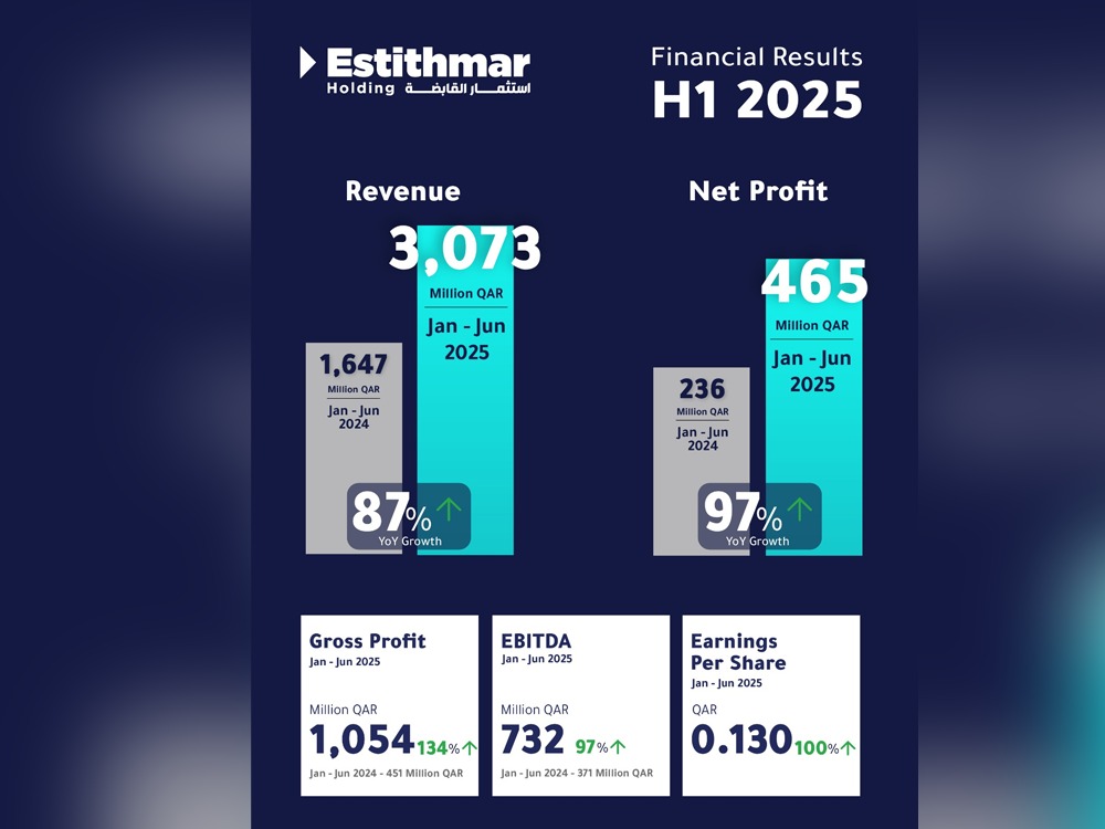 Doha: Revealing an exceptional performance across all key financial metrics, Estithmar Holding Q.P.S.C. announced its financial results for the six-month period ended 30 June 2025, following board approval.