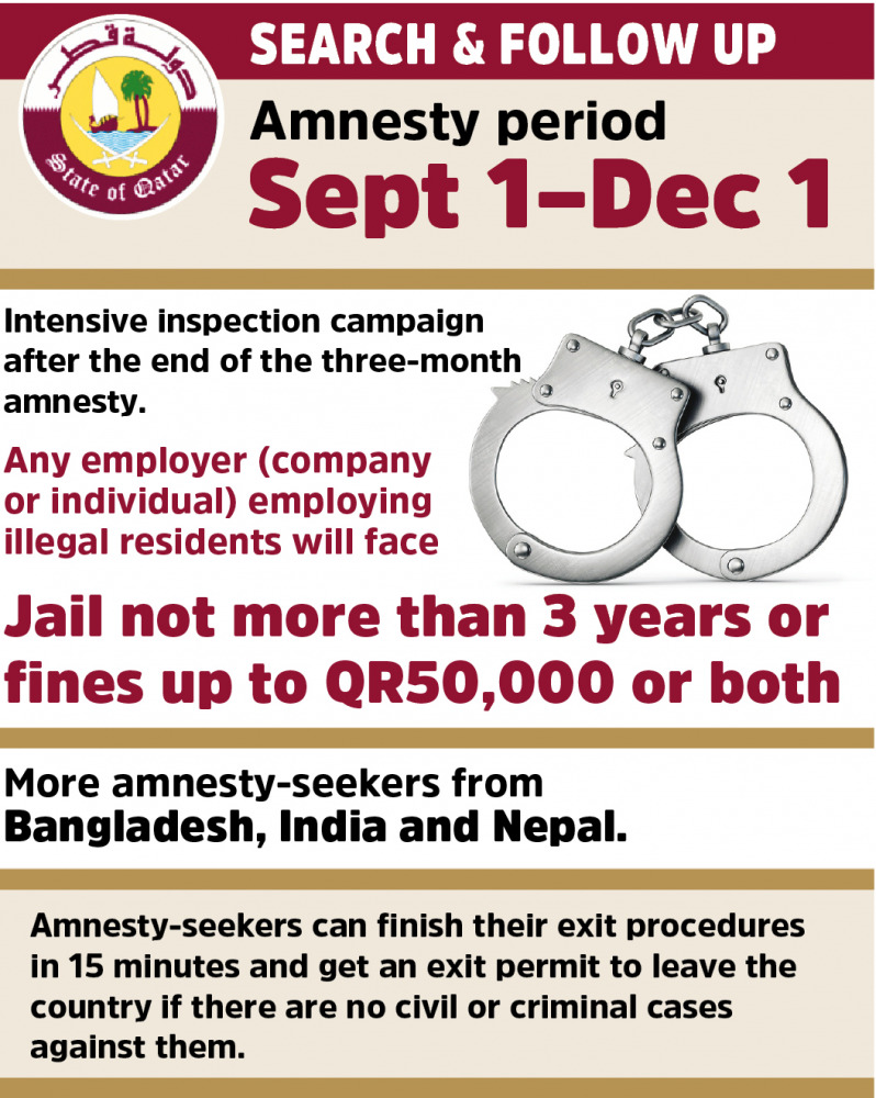 In an exclusive interview with The Peninsula, the Director of Search and Follow Up Department Brig Abdullah Jaber Lebdah said that a number of people have already availed of the amnesty scheme and the turn- out “is expected to reach its highest by the end of the grace period, especially, because the beneficiaries of the amnesty can leave the country without facing any legal action or fines as they are waved during the amnesty period." The amnesty will end on December 1.
