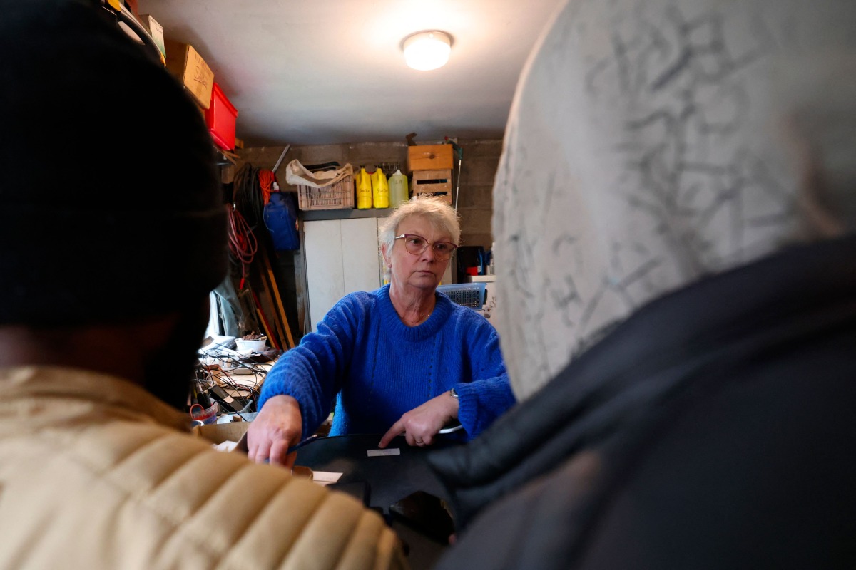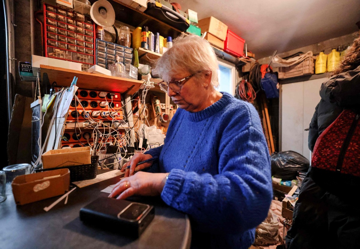 Brigitte Lips, nicknamed Mamie Charge registers phones of migrants to be charged at her garage in Calais on November 26, 2024. (Photo by DENIS CHARLET / AFP)