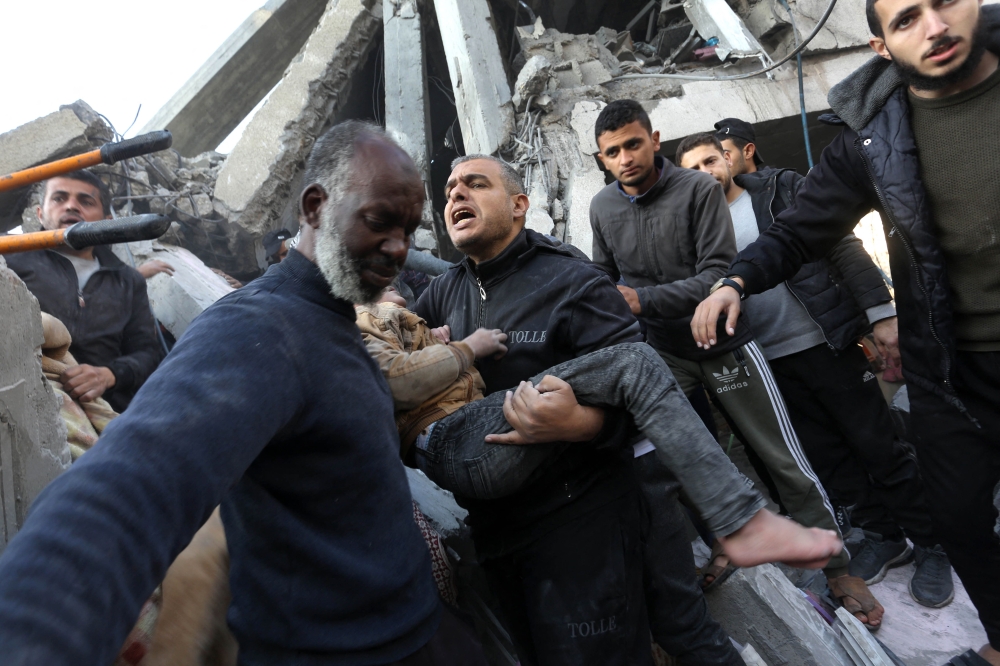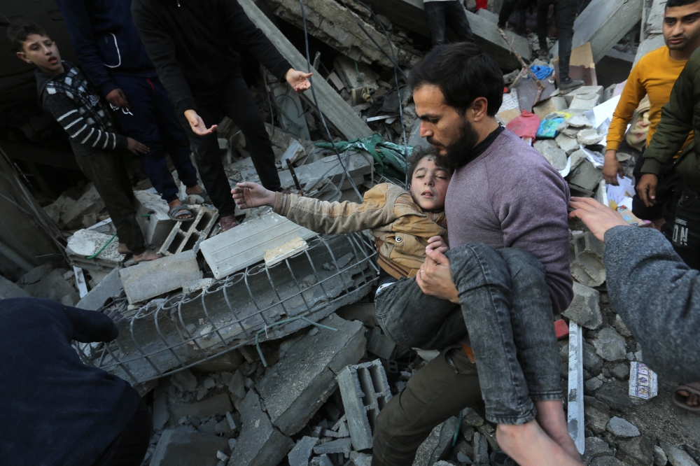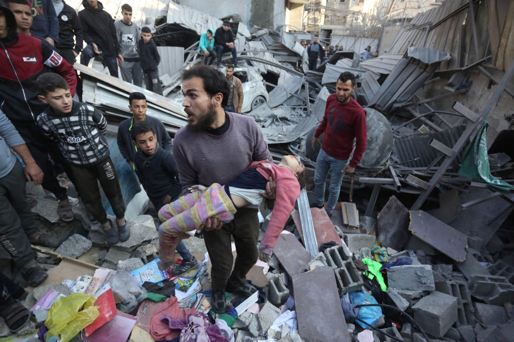 A Palestinian man evacuates a wounded girl from the site of an Israeli strikes on the Zawayda area of the central Gaza Strip on December 30, 2023. (Photo by AFP)