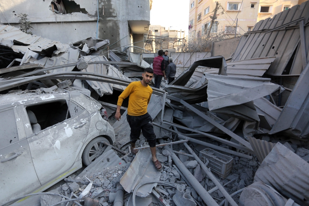 Palestinians inspect damage following Israeli strikes on the Zawayda area of the central Gaza Strip on December 30, 2023 (Photo by AFP)