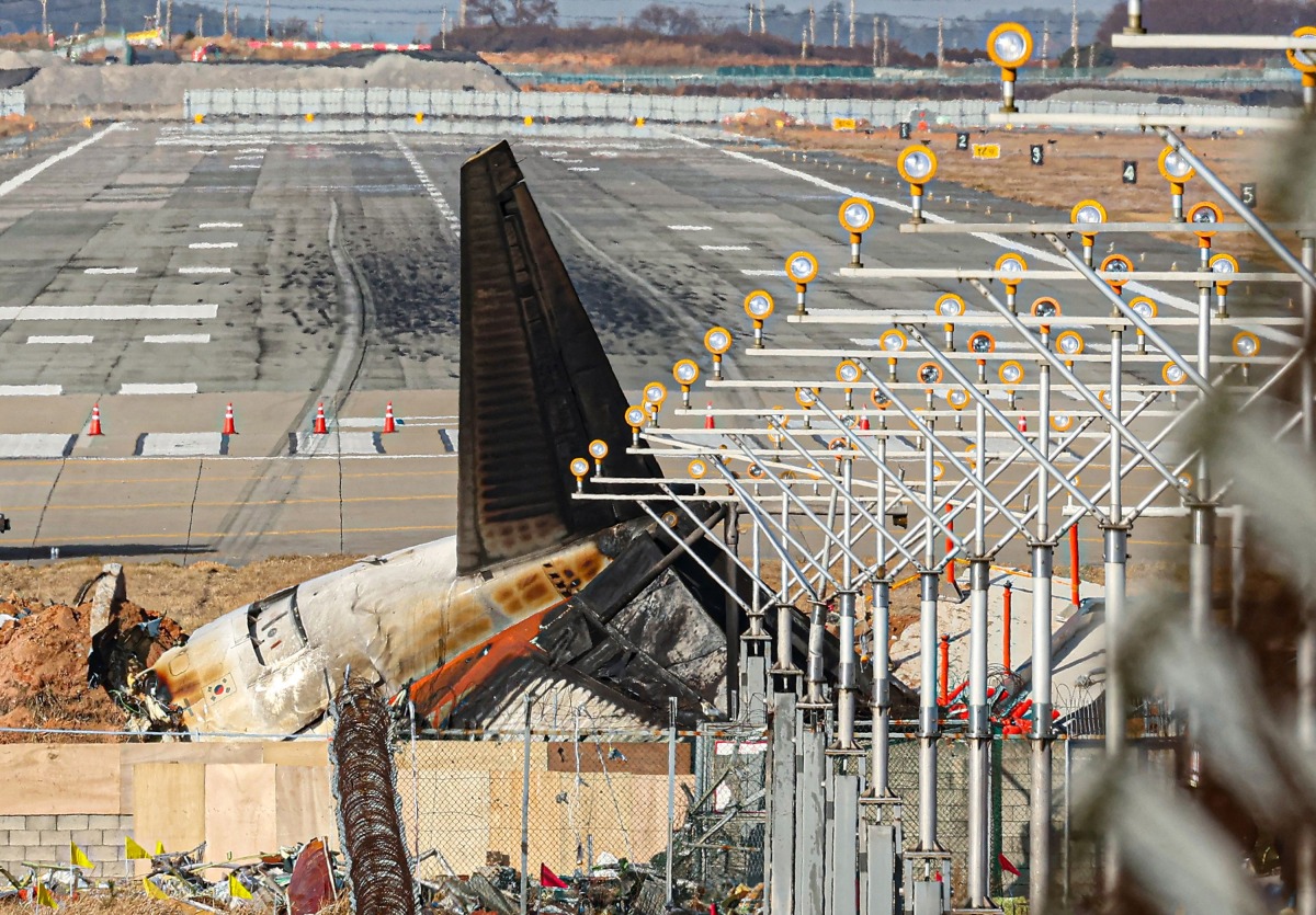 The wrecked tail section of the Jeju Air Boeing 737-800 aircraft that crashed and burst into flames is seen at the end of the runway at Muan International Airport in Muan, some 288 kilometres southwest of Seoul on December 30, 2024. Photo by YONHAP / AFP