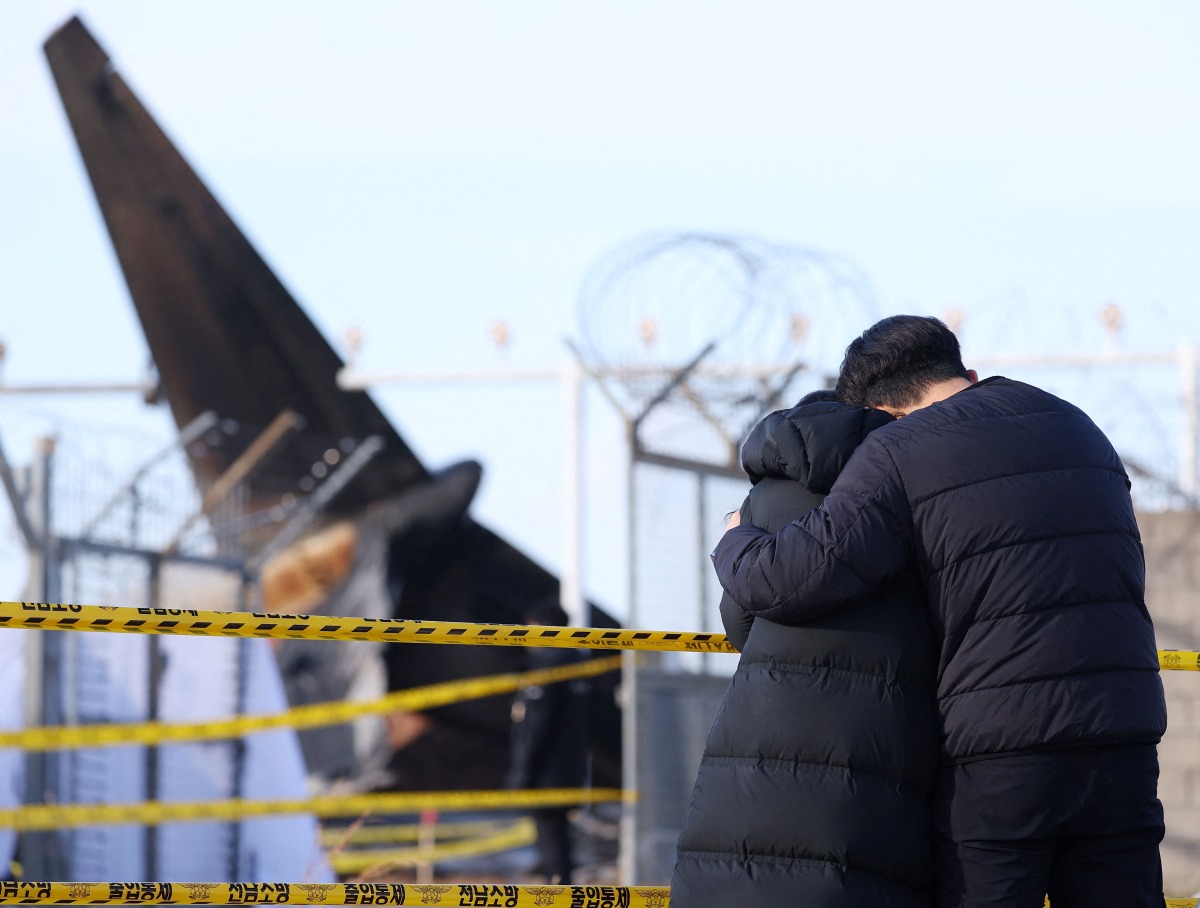 Bereaved family members stand at the scene where a Jeju Air Boeing 737-800 series aircraft crashed and burst into flames at Muan International Airport in Muan, some 288 kilometres southwest of Seoul on December 30, 2024. Photo by YONHAP / AFP