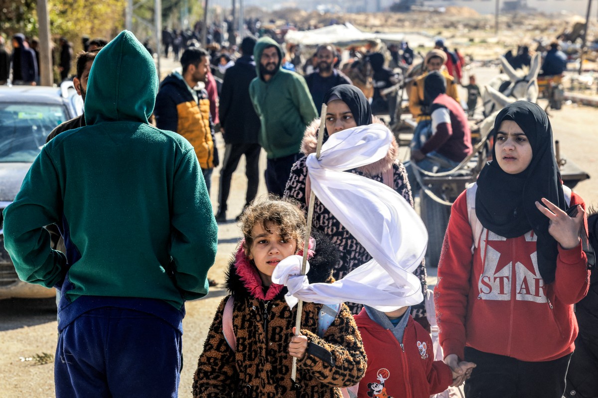A girl holds a make-shift white flag as she walks with other displaced Palestinians fleeing from Khan Yunis in the southern Gaza Strip on January 30, 2024. Photo by Mahmud Hams / AFP