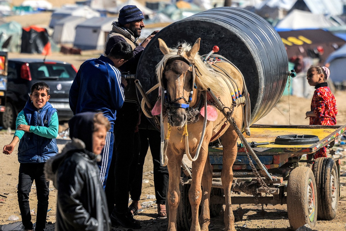 A man and children stand by a cistern placed atop a horse-drawn cart near a make-shift shelter for Palestinians who fled to Rafah in the southern Gaza Strip on January 30, 2024. Photo by Mahmud Hams / AFP