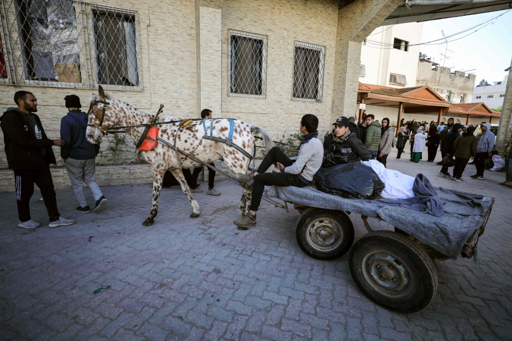 Palestinian youths transport bodies in a horse-pulled cart, near the Ahli Arabi hospital in Gaza City, on January 31, 2024. (Photo by AFP)