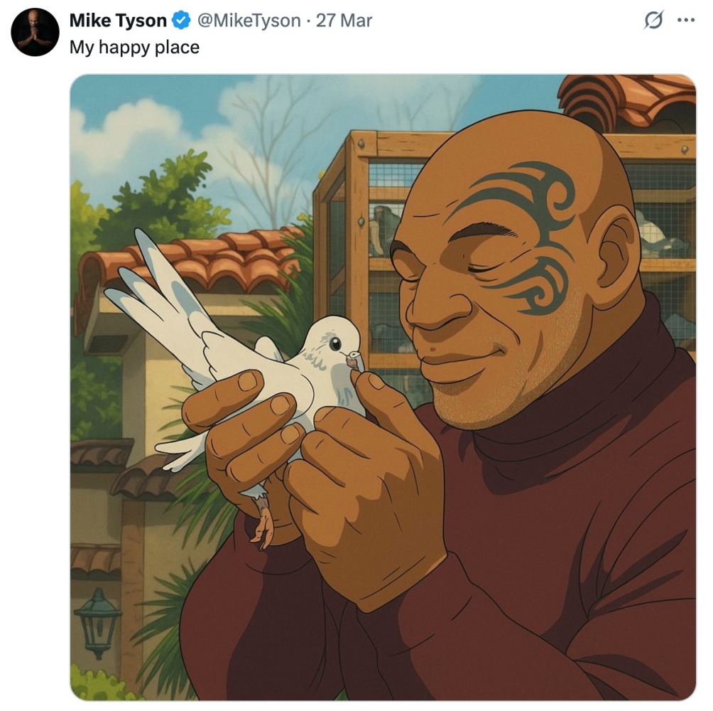 Social media platforms, particularly X, were quickly inundated with AI-generated Ghibli memes, ranging from witty pop culture mashups to whimsical, dreamlike landscapes. Among the most viral creations are reimagined the classic memes in Ghibli’s signature aesthetic, while former boxer Mike Tyson also joined in by sharing an AI portrait of himself in Ghibli style, peacefully holding a dove.