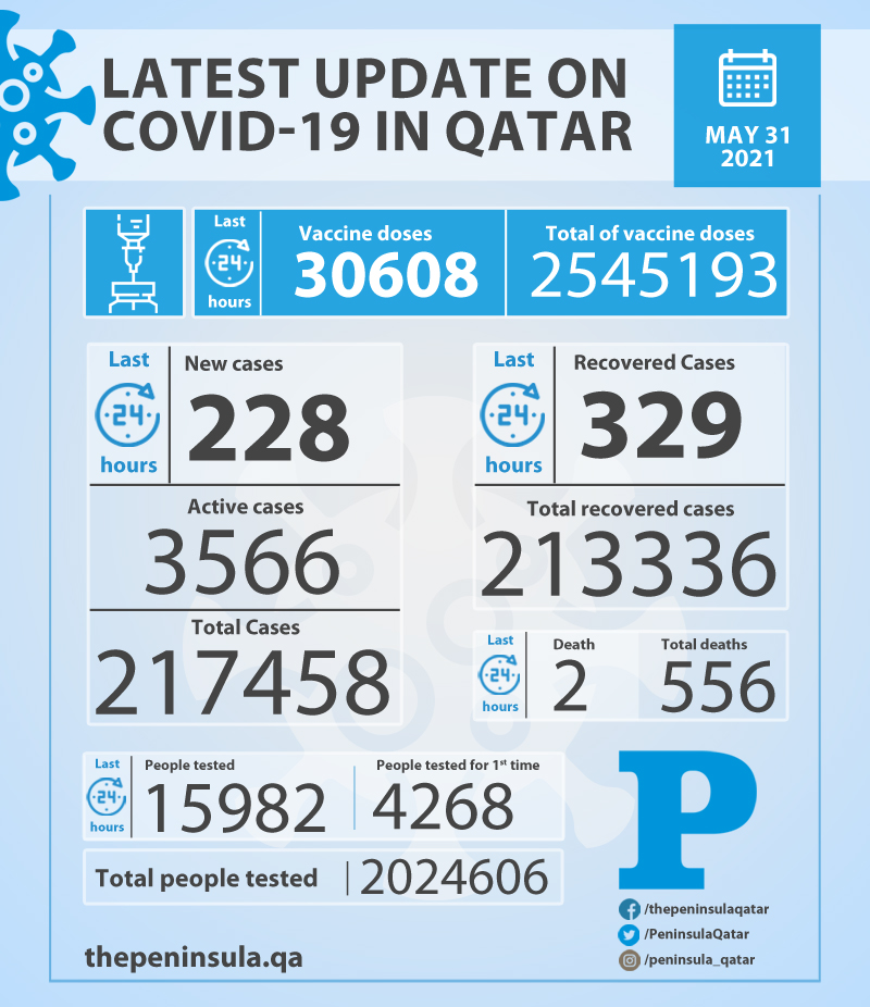 Doha: Ministry of Public Health (MoPH) today reported 228 new cases of coronavirus (Covid-19) and 329 people recovered from the virus in the last 24 hours, bringing the total number of people recovered in Qatar to 213,336