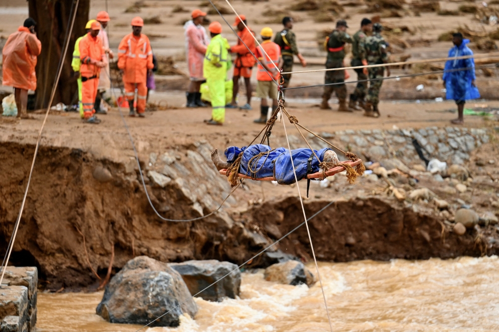 The only bridge connecting the worst-hit villages of Chooralmala and Mundakkai was washed away, so rescue teams were forced to use ziplines to cart bodies out of the disaster site.