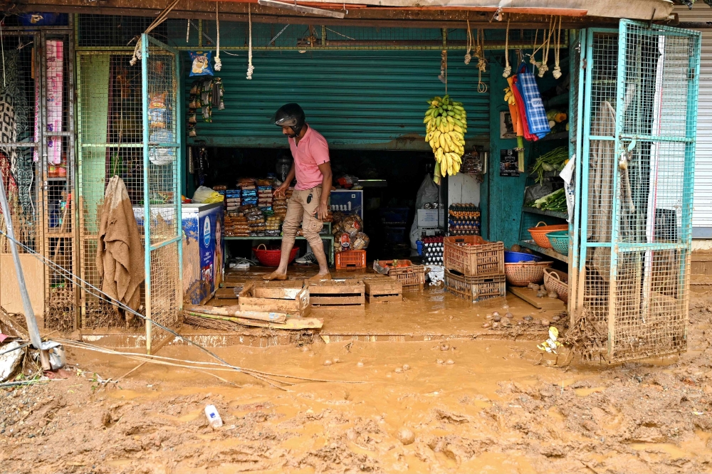 A man stands amid mud at a store, after landslides in Wayanad on July 31, 2024. (Photo by Idrees Mohammed / AFP)