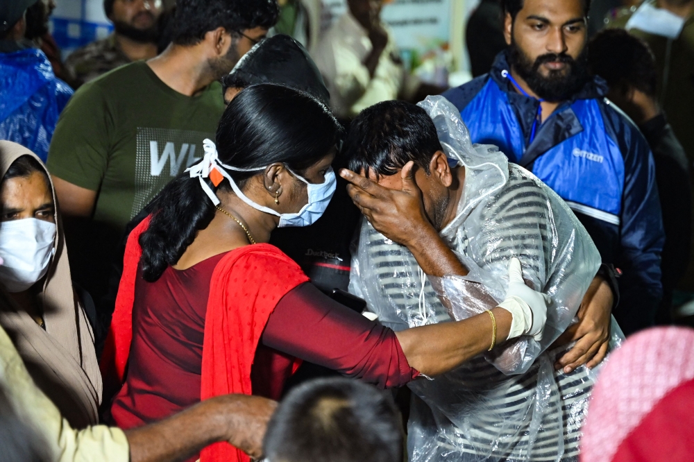 Relatives react at a primary health centre following a landslide at Meppadi in Kerala's Wayanad district on July 30, 2024. (Photo by Idrees Mohammed / AFP)