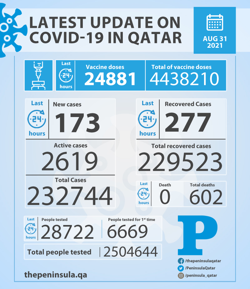 Doha: Ministry of Public Health (MoPH) today reported 173 new cases of coronavirus (Covid-19) and 277 people recovered from the virus in the last 24 hours, bringing the total number of people recovered in Qatar to 229,523.
