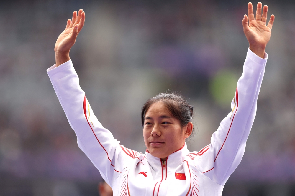 China's Yuping Zhao gold medalist celebrates on the podium during the victory ceremony for the women's F13 javelin throw final athletics event at the Paris 2024 Paralympic Games at Stade de France in Saint-Denis, north of Paris on August 31, 2024. (Photo by Franck FIFE / AFP)