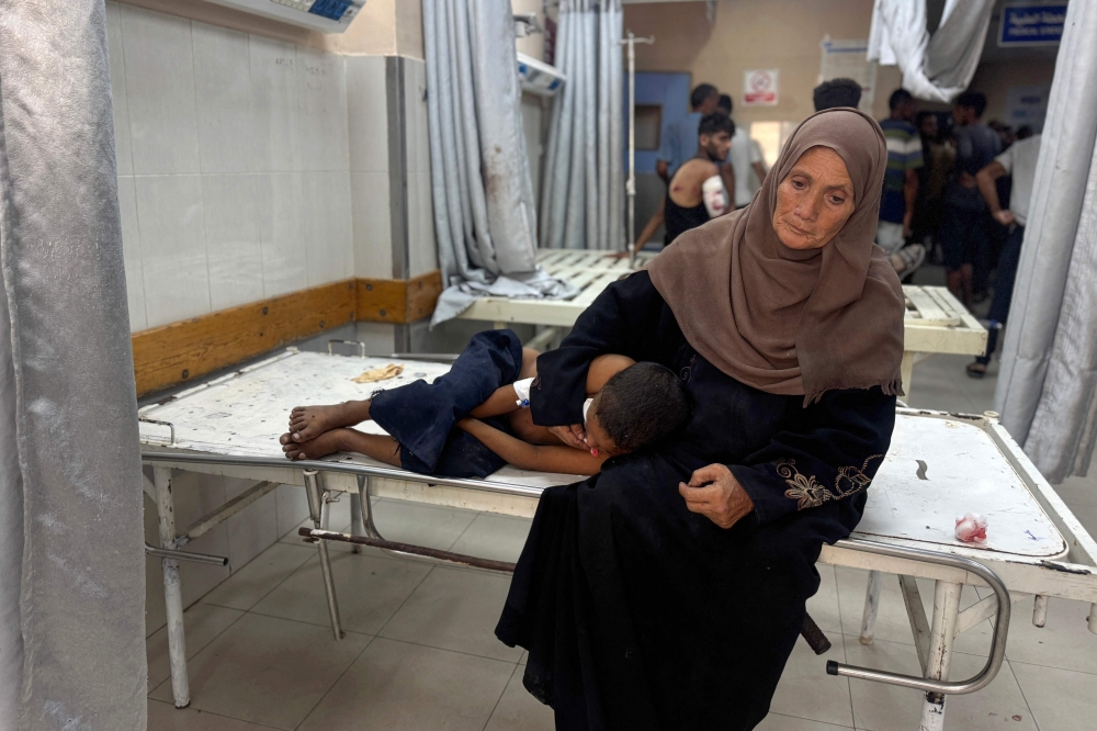 Graphic content / A Palestinian woman comforts a child at the Nasser hospital in Khan Yunis in the southern Gaza Strip on August 31, 2025. (Photo by AFP)